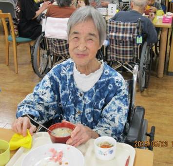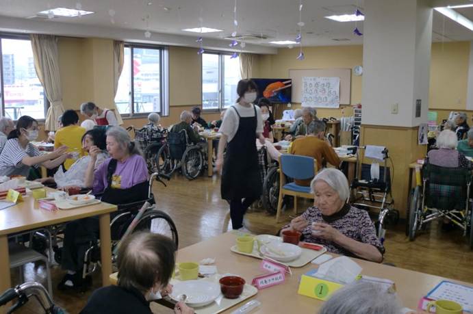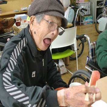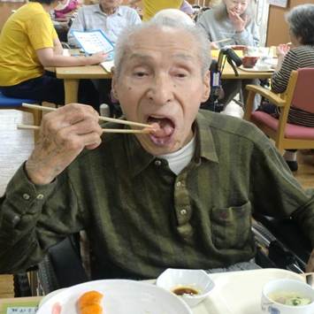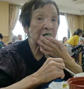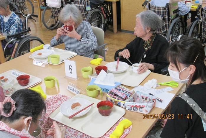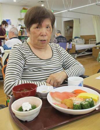 お寿司は皆さん好物のご様子で、普段お食事が進まない方もこの日はよく噛んで味わって頂き、召しあがる量もいつもよりも多かったです。介助で食べている方もこの日はご自身で食べることができた方もいらっしゃいました。とにかく、お寿司の力は絶大で、利用者の皆さんの笑顔と「美味しい!」の声と箸が止まらない様子がとても印象的で、こちらまで嬉しい気持ちにさせて頂きました。